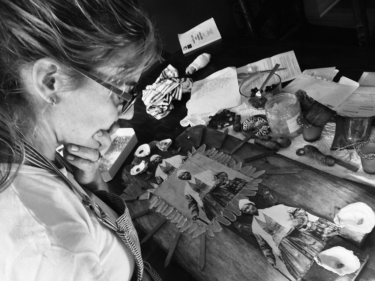 I use similar objects throughout this body of work to express that these incredible individuals were connected through friendship. I also use "dangerous” items like shattered glass, rusty nails, bullets and matches to symbolize the risks abolitionists willingly suffered. And I use images found in religious icons to present these American abolitionists as saints in my mixed-media assemblage.